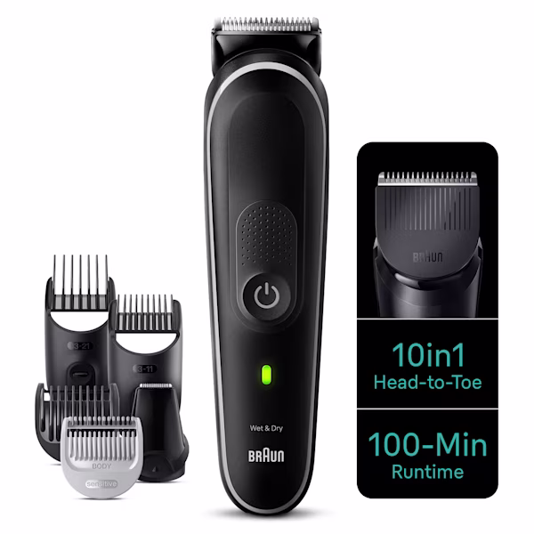 Braun’s 10-in-1 Style Kit for head-to-toe grooming: curated tools for beard, ear & nose trimming, hair clipping and manscaping your whole body.
