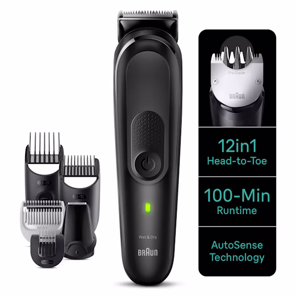 Braun’s 12-in-1 Style Kit for head-to-toe grooming: curated tools for beard, ear & nose trimming, hair clipping and manscaping your whole body.